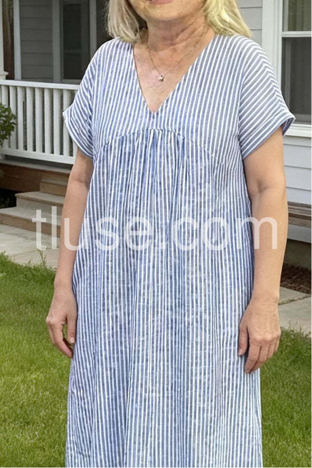 Youthful Striped Print V-Neck Midi Dress
